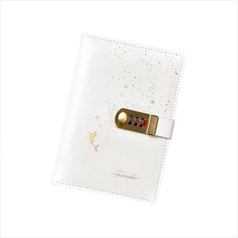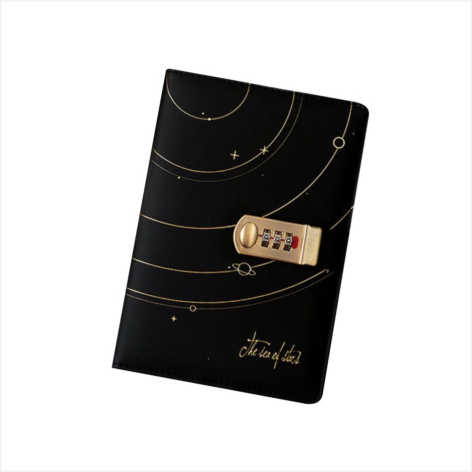 หน้าปกของไดอารี่พร้อมกุญแจนี้ทำมาจากเทคโนโลยีเคลือบทองอันวิจิตรงดงาม ซึ่งแสดงเส้นโคจรคล้ายกับวงโคจรของดาวเคราะห์ด้วยเส้นเรียบง่าย มีจุดเล็กๆ เช่น ดวงดาวประปราย ราวกับควบแน่นท้องฟ้ายามค่ำคืนอันลึกลับลงในภาพ เงียบสงบ และเต็มไปด้วยจินตนาการ มีรหัสล็อคแบบโลหะสีทองซึ่งควบคุมด้วยรหัสผ่านสามหลัก คุณสามารถตั้งรหัสผ่านของคุณเองเพื่อให้แน่ใจว่ามีเพียงคุณเท่านั้นที่สามารถเปิดเนื้อหาได้