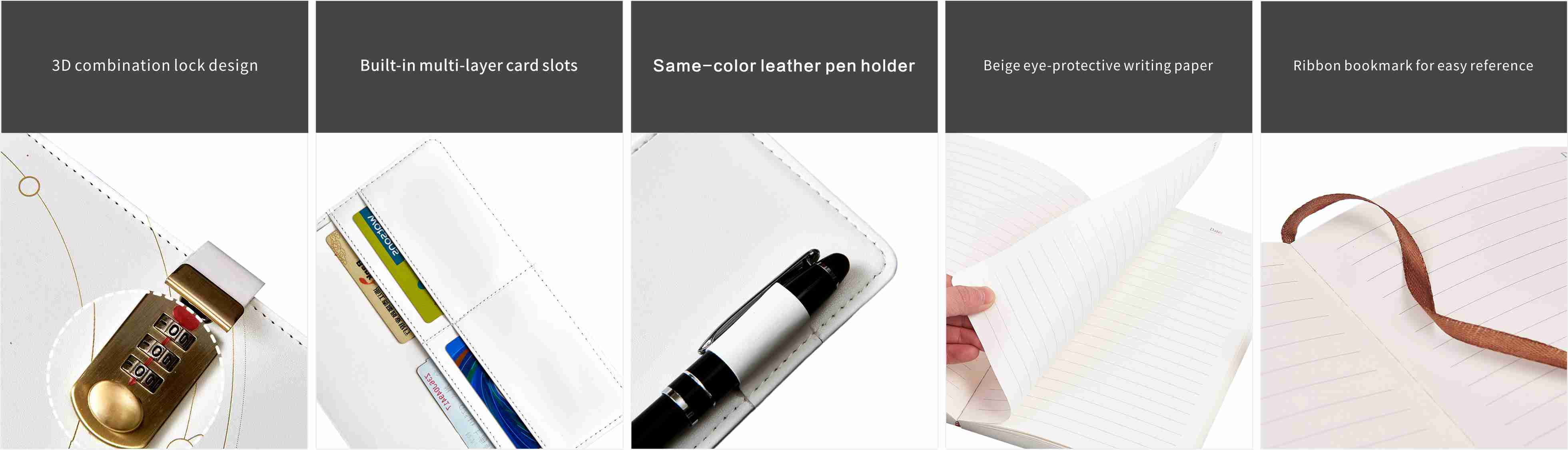 ด้านข้างหนังสือมีที่เสียบปากกาซึ่งสะดวกสำหรับคุณในการวางปากกาสำหรับใช้งานประจำวัน เมื่อคุณต้องการบันทึก คุณสามารถหยิบปากกาและเขียนได้อย่างสบายๆ โน้ตบุ๊กมาพร้อมกับช่องกระเป๋าในตัวซึ่งสามารถใช้เก็บการ์ดได้ ซึ่งเหมาะมากสำหรับการจัดเก็บการ์ด (เช่น บัตรประจำตัวประชาชนหรือบัตรธนาคาร) โน้ตชั่วคราว หรือสิ่งของจำเป็นเล็กๆ น้อยๆ ทำให้ไดอารี่กลายเป็นตัวจัดระเบียบอเนกประสงค์ที่ง่ายต่อการพกพา